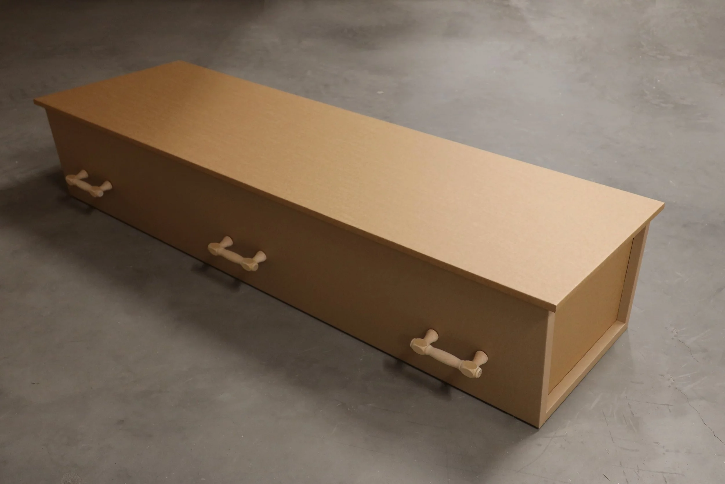 Kiste fremstillet af 94 % papir og 6 % bambus, med rebhåndtag og tilvalg af polstring. Vejer kun 12 kg.* Kun til kremering.