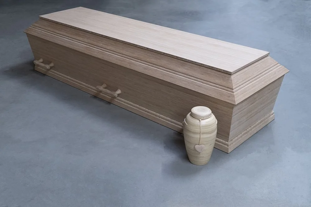 Bæredygtig kiste fremstillet i bambus. Kun til kremering.