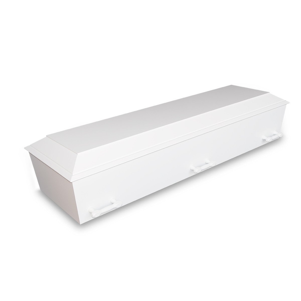 Hvidlakeret kiste til kremering eller jordfæstelse. Kan fås i andre farver mod bestilling og ekstra tillæg.*.